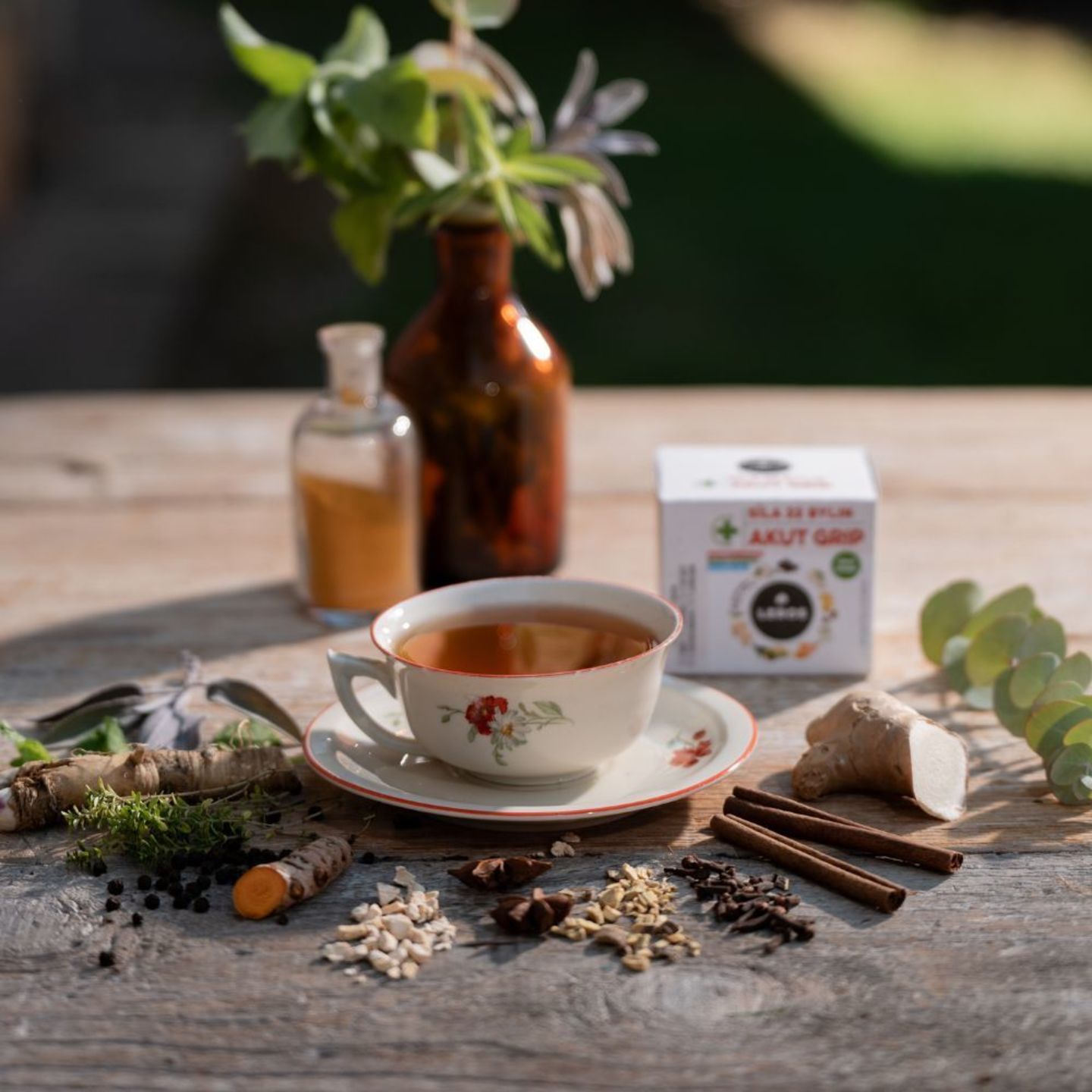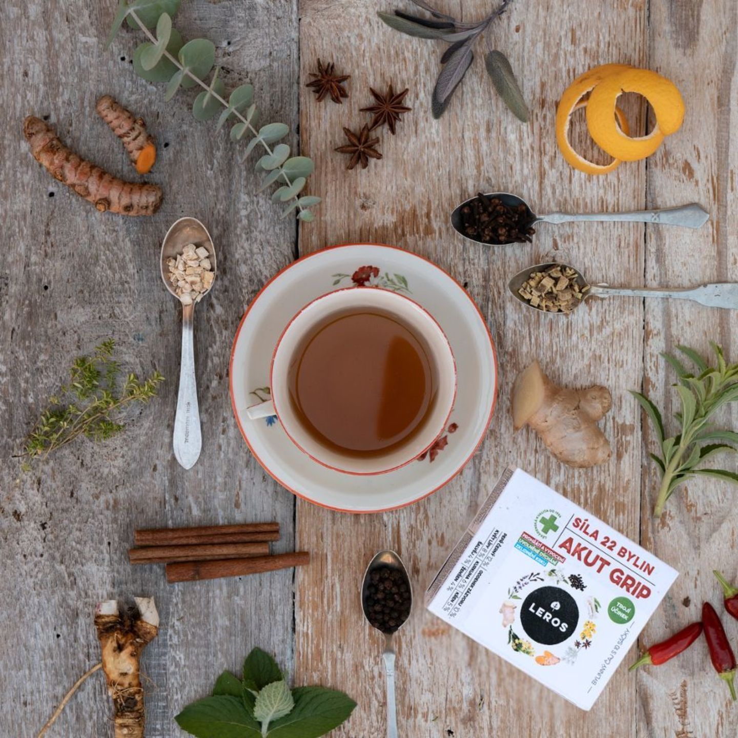 Silně funkční prohřívací směs 22 bylin pro podporu obranyschopnosti a normální funkci dýchacích cest. Výjimečná kombinace posílí imunitní systém a celkovou vitalitu těla. Lékořice a šalvěj přispívají ke zklidnění v krku a dýchacích cestách. Aromatické výpary eukalyptu a máty obsažené v nálevu přispívají k uvolněnému dýchání a osvěžení těla. Směs obsahuje přirozené antioxidanty, které pomáhají chránit buňky před oxidativním stresem. Jaký má čaj trojí účinek? - prohřeje (zázvor, pepř, křen, špetka chilli, skořice a lípa) - uvolní dýchání (šalvěj, eukalyptus, badyán a hřebíček) - zklidní krk Dopřejte si horký šálek Síly 22 bylin AKUT GRIP, zastavte se a nechte se obejmout silou přírody.