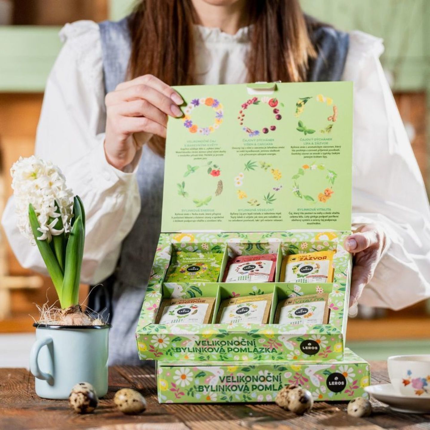 Dárková kazeta s výběrem 6 voňavých čajů ideálních ke svátečnímu jarnímu období. Novinkou je velikonoční čaj s barevnými květy s kopřivou, mateřídouškou a petrklíčem. Bylinkové čaje podpoří vitalitu, energii a veselost.